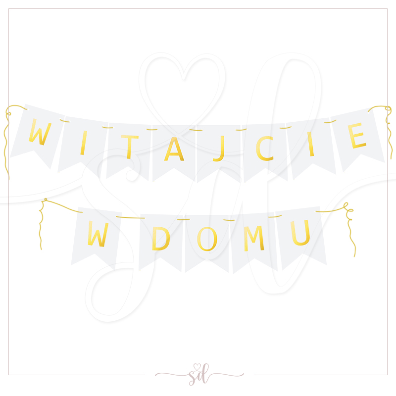 Kupujesz napis Witajcie w domu wykonany z papierowych, białych flagietek ze złotymi napisami.